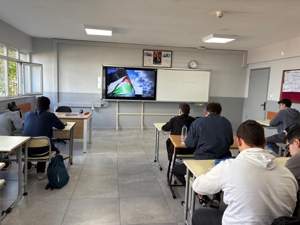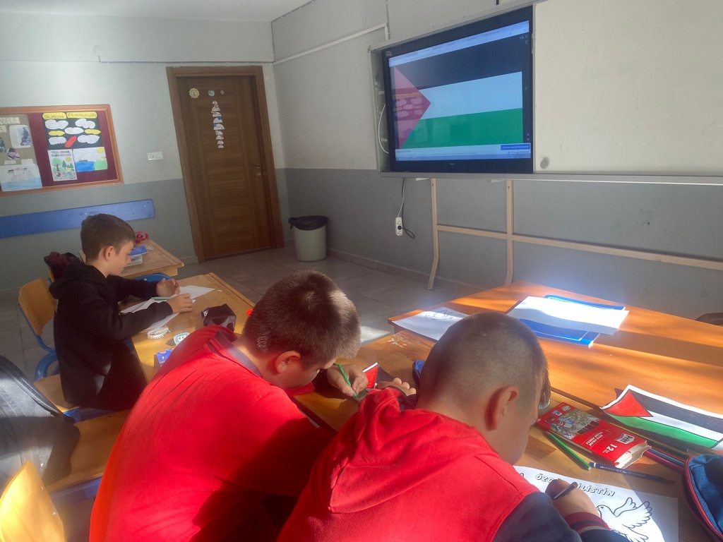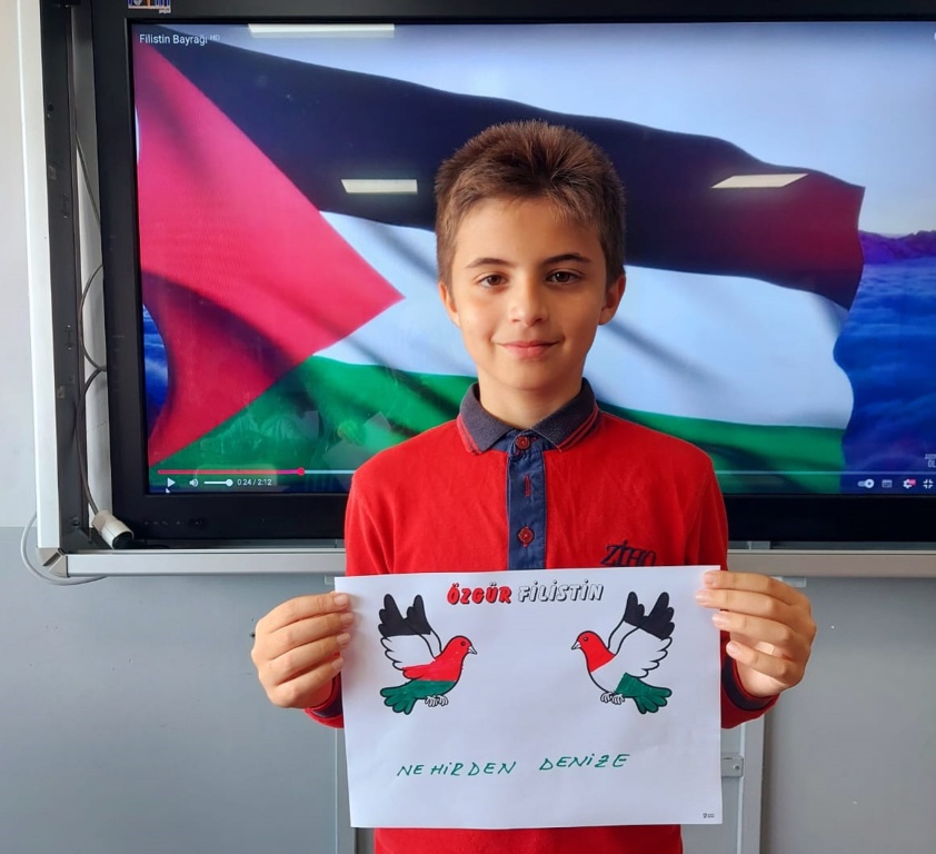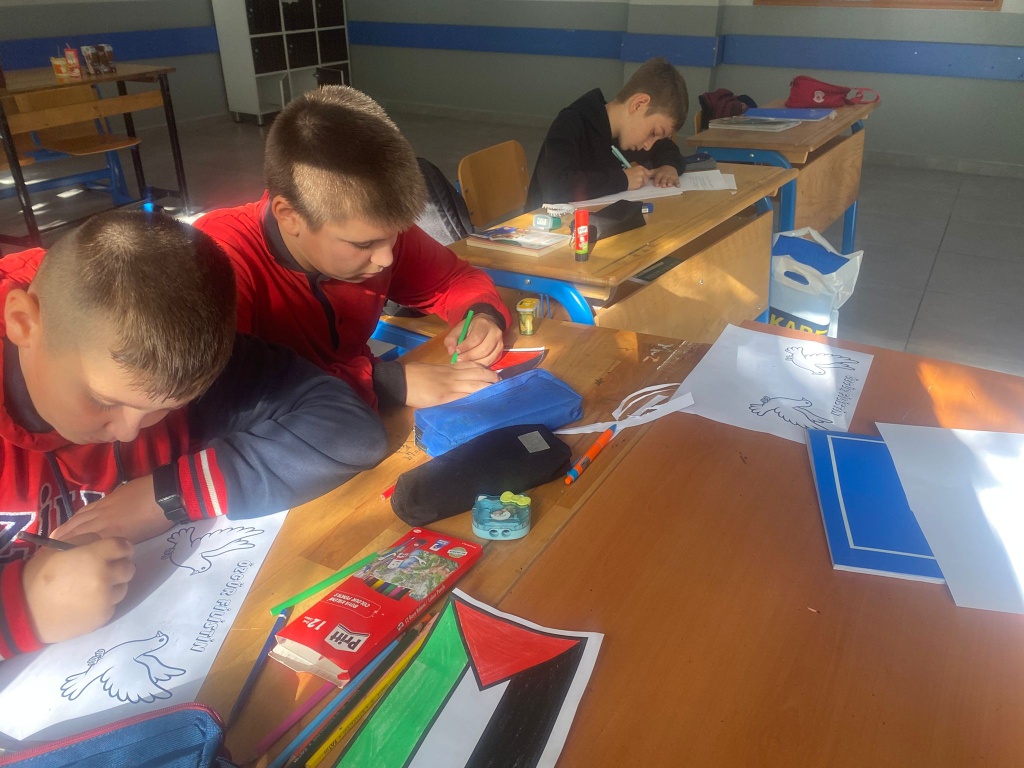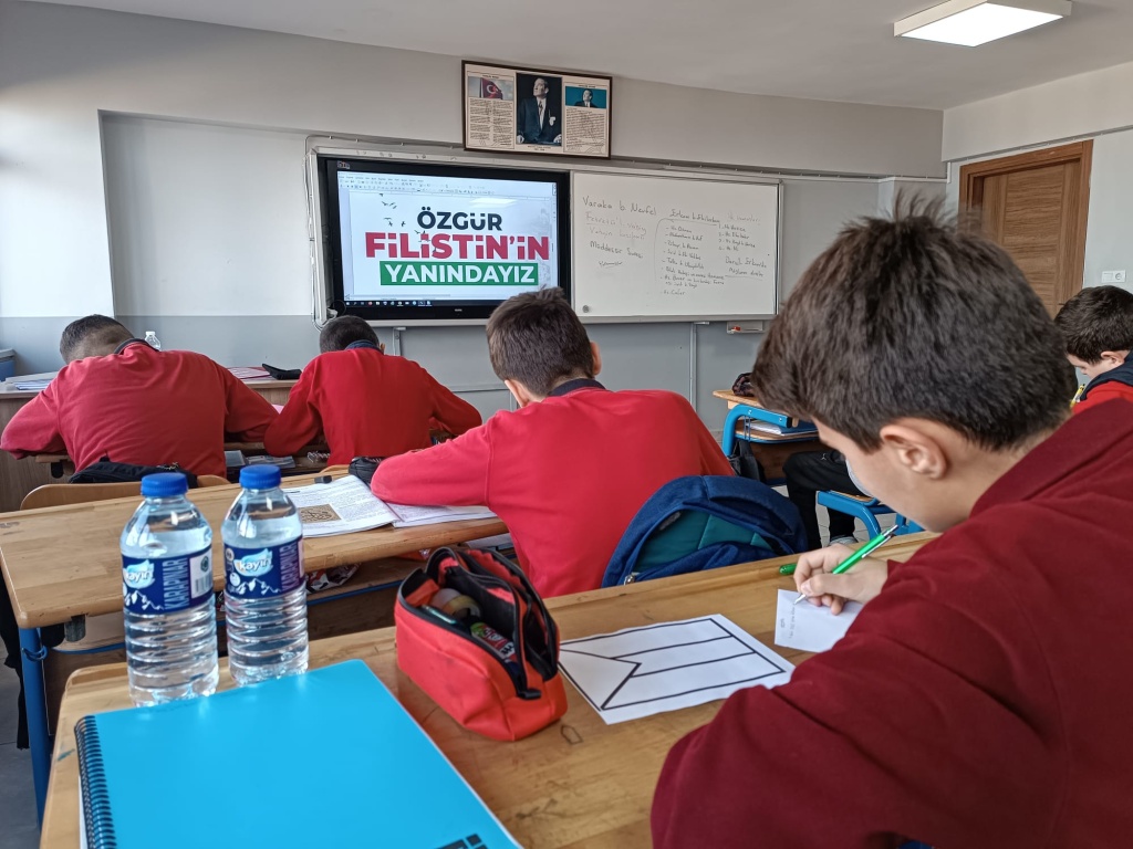 "Filistin Farkındalık Etkinlikleri " kapsamında Filistinde Çocuk Olmak" ana teması çercevesinde "Filistinli Çocuklar İçin Bir Şiir De Sen Yaz" ,"Filistin Bayrağı Boyama"ve "Özgür Filistin Afişi" tasarım etkinliği düzenlendi.Tüm öğrencilerimizin katılımıyla gerçekleşen etkinlikte öğrencilerimiz yazdıkları şiirlerle Filistinli Çocukların sıkıntılarını dile getirdiler ,çizdikleri Filistin Bayrakları ve afişlerle de Filistinin özgürlüğünün önemine vurgu yaptılar.